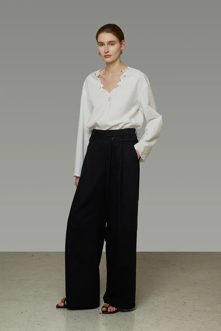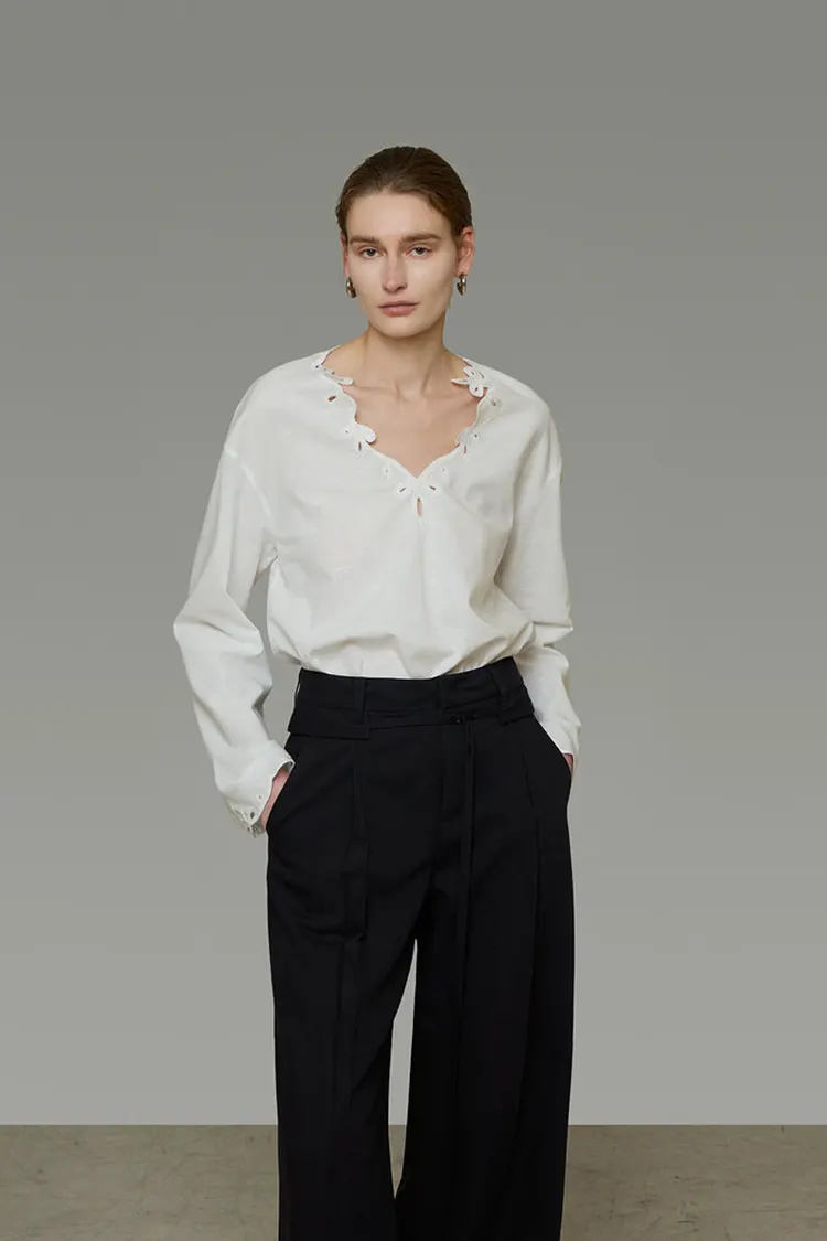 A V-nyak finom hímzett csipkekivágással van díszítve, precízen kalibrált mintázatsűrűséggel, amely finom részleteket kölcsönöz.