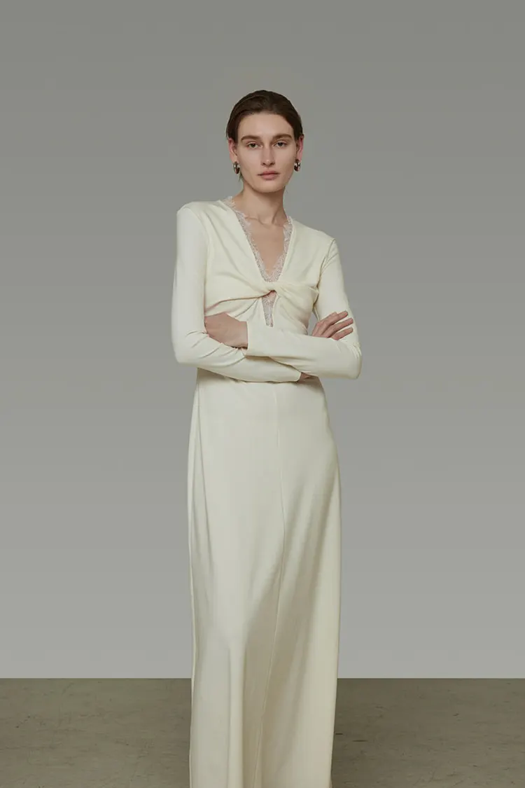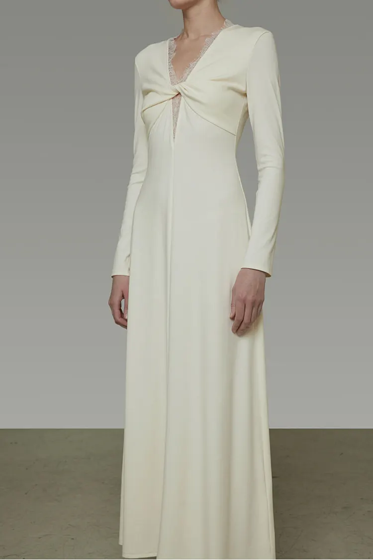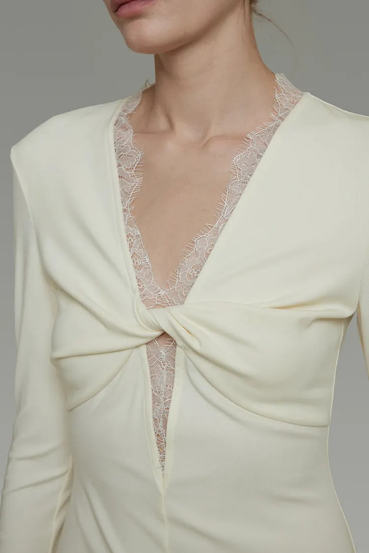 A V-nyak mentén lévő csipke gondosan kézzel van rögzítve, ügyes zárvarrással, amely tökéletesen illeszkedik a ruha sziluettjéhez.